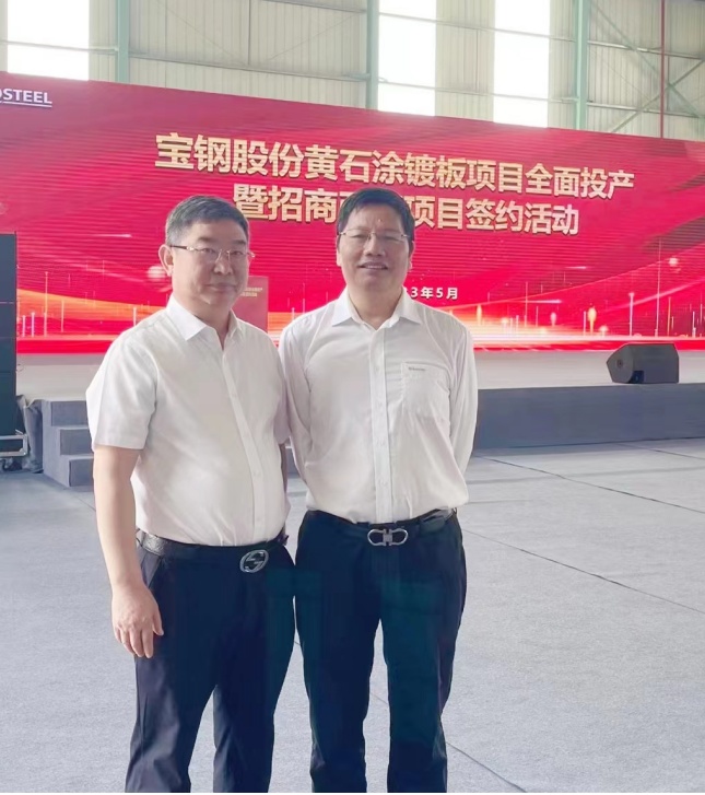 董事長劉國民和寶鋼股份黃石涂鍍板有限公司總經(jīng)理助理兼制造部部長劉浩洲(左三)